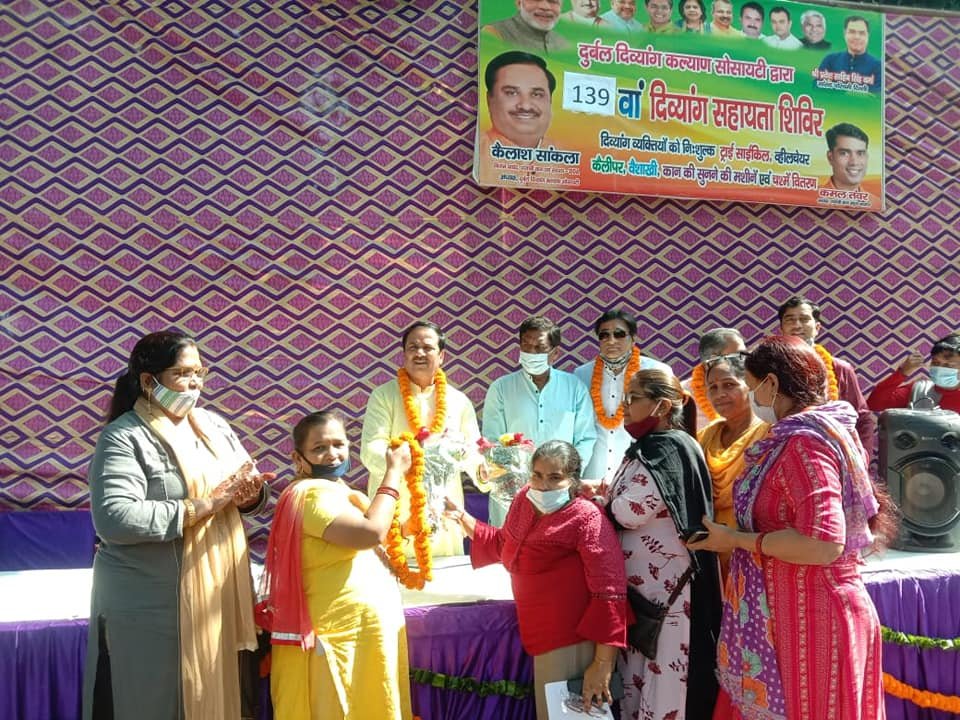 साईकल,व्हीलचेयर, ट्राईसाईकल, कान की सुनने की मशीनें, बैसाखी, बेरोजगार युवक युवतियों को रोजगार के अवसर दिए गए एवं चश्मे वितरण किए गए।
