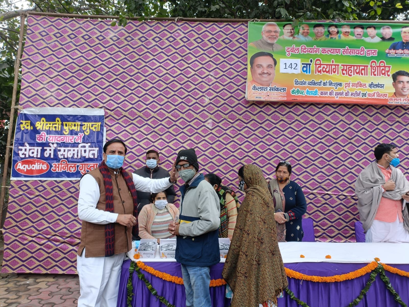 दुर्बल दिव्यांग कल्याण सोसायटी द्वारा 142 वा सहायता शिविर आयोजित किया गया। जिसमें जरूरतमंद दिव्यांग व्यक्तियों को नि:शुल्क ट्राईसाईकिल, व्हीलचेयर, कान की सुनने की मशीनें, कैलीपर, वैशाखी, बेरोजगार युवक-युवतियों के लिए रोजगार के अवसर प्रदान कराना एवं चश्मे इत्यादि वितरण किए गए। पश्चिमी जिला कार्यालय प्रभारी श्री रमेश यादव, पंजाबी बाग मंडल अध्यक्ष श्री कमल तंवर, मादीपुर मंडल अध्यक्ष श्री सुंदर निगम, महामंत्री एडवोकेट श्रीमती हर्षबाला, मंत्री श्रीमती राज साहनी, कुमारी मोनिका, श्रीमती अंजू देवी, श्री महेश निगम, श्रीमती मीनाक्षी शर्मा, श्री राजेश हरसौरा इत्यादि साथ रहें।