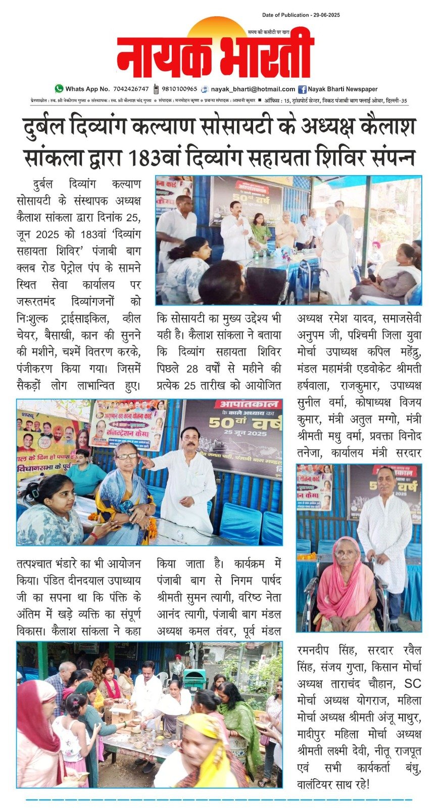 दुर्बल दिव्यांग कल्याण समिति द्वारा 183 वा सहायता शिविर की अख़बारो में प्रकाशित खबरें।