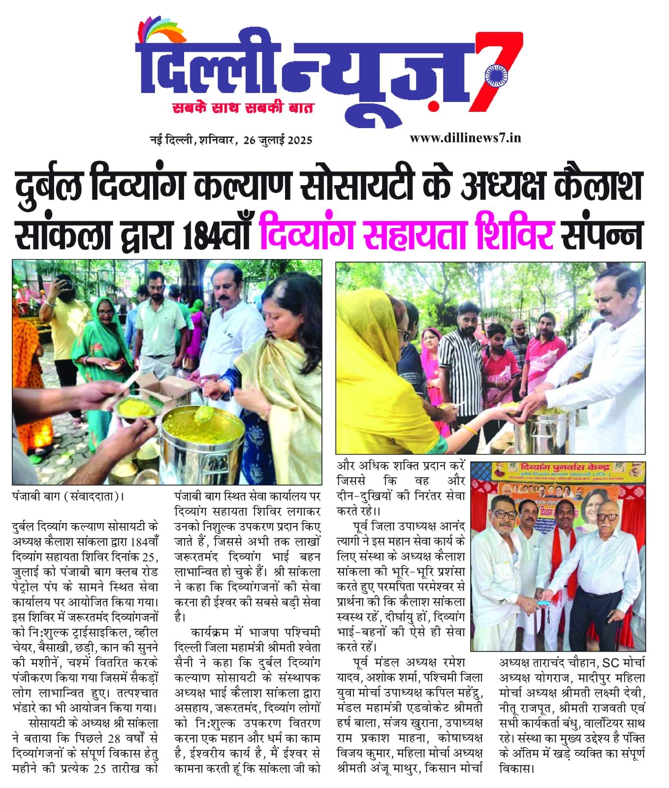 दुर्बल दिव्यांग कल्याण सोसायटी द्वारा किए गए कार्यों की समाचार पत्र में प्रकाशित खबरें ।