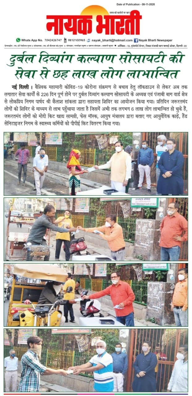 आज दिनांक 8 नवम्बर 2020 को 226 वें दिन भी दुर्बल दिव्यांग कल्याण सोसायटी के तत्वावधान में आयुर्वेदिक काढ़ा व मास्क वितरण किए गए।
