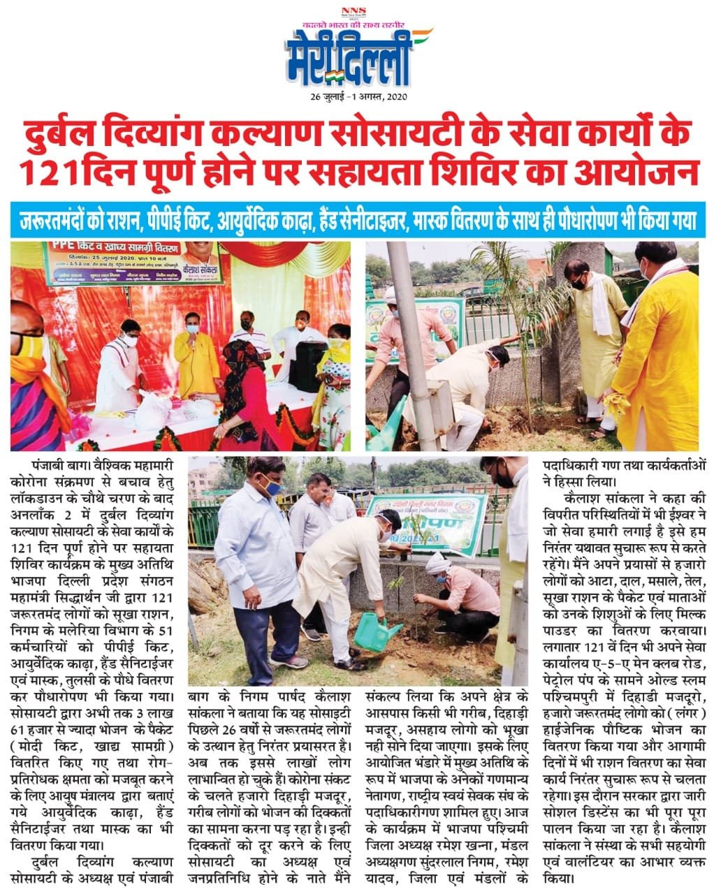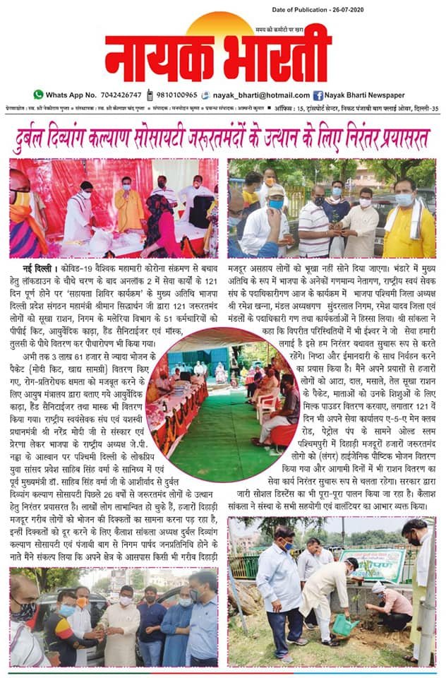 आज दिनांक 25 जुलाई 2020 को 121 वें दिन दुर्बल दिव्यांग कल्याण सोसायटी के तत्वावधान पंजाबी बाग़ वार्ड में ज़रूरतमंद लोगो को राशन (मोदी किट), कोरोना वॉरियर्स की PPT किट वितरित कर, दयानंद पार्क में वृक्षारोपण किया गया, जिसमे हमारे साथ संगठन महामंत्री श्री सिद्धार्थन जी, माननीय श्री मुकेश जी, जिलाध्यक्ष श्री रमेश खन्ना जी एवं भाजपा कार्यकर्ता उपस्थित रहे।