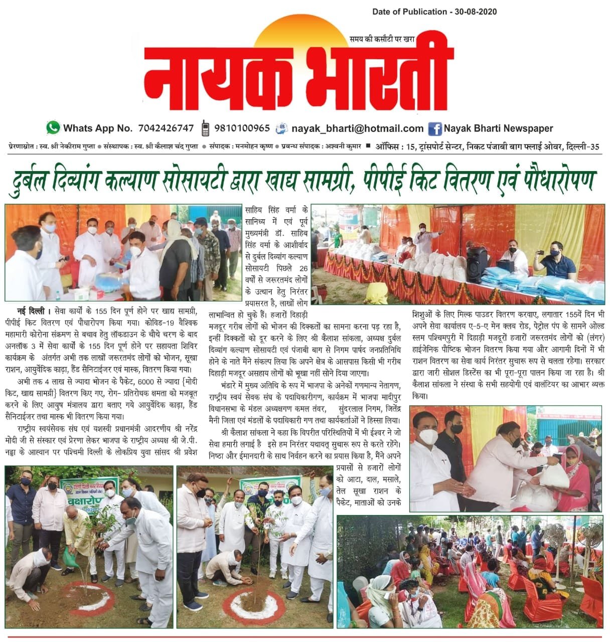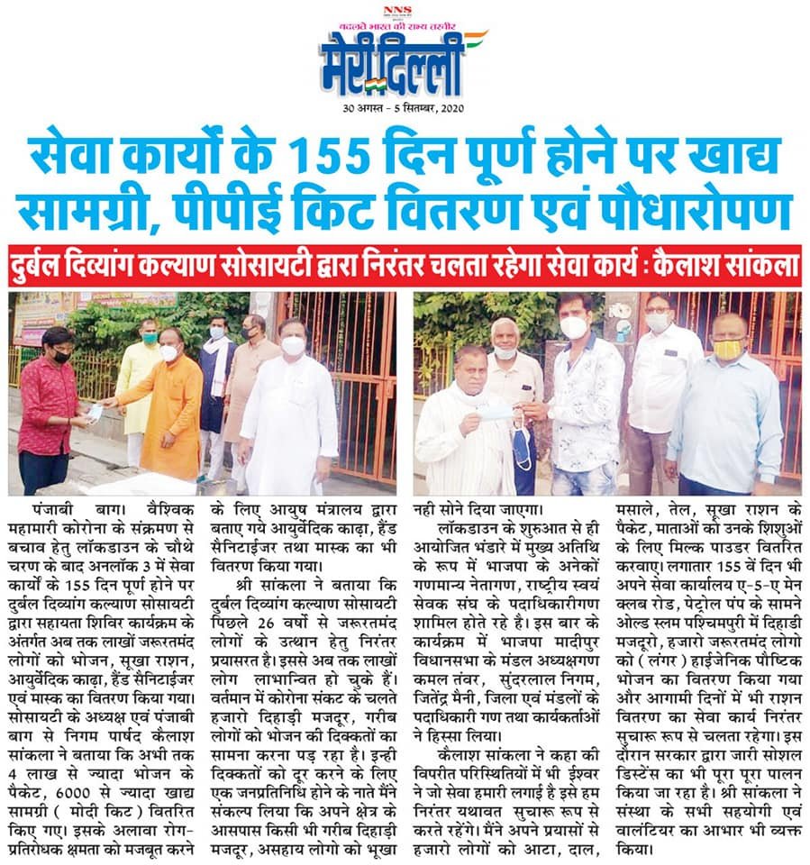 आज दिनांक 31 अगस्त 2020 को 157 वें दिन दुर्बल दिव्यांग कल्याण सोसायटी के तत्वावधान में आयुर्वेदिक काढ़ा व मास्क वितरण किए गए।
