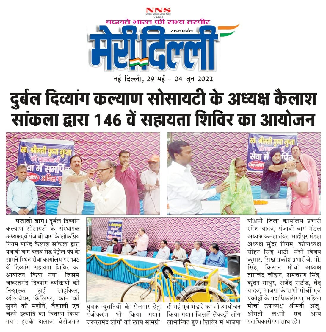 दुर्बल दिव्यांग कल्याण सोसायटी द्वारा पंजाबी बाग कल्ब रोड स्थित सेवा कार्यालय पर #146_वेंदिव्यांगसहायता_शिविर संपन्न हुआ । जिसमें जरूरतमंद दिव्यांग व्यक्तियों को नि:शुल्क ट्राई साइकिल, व्हीलचेयर, कैलिपर, कान की सुनने की मशीनें, वैशाखी एवं चश्मे इत्यादि वितरण किए गए। बेरोजगार युवक-युवतियों के लिए रोजगार हेतु पंजीकरण किया गया जिसमें सैकड़ों लोग लाभान्वित हुए।